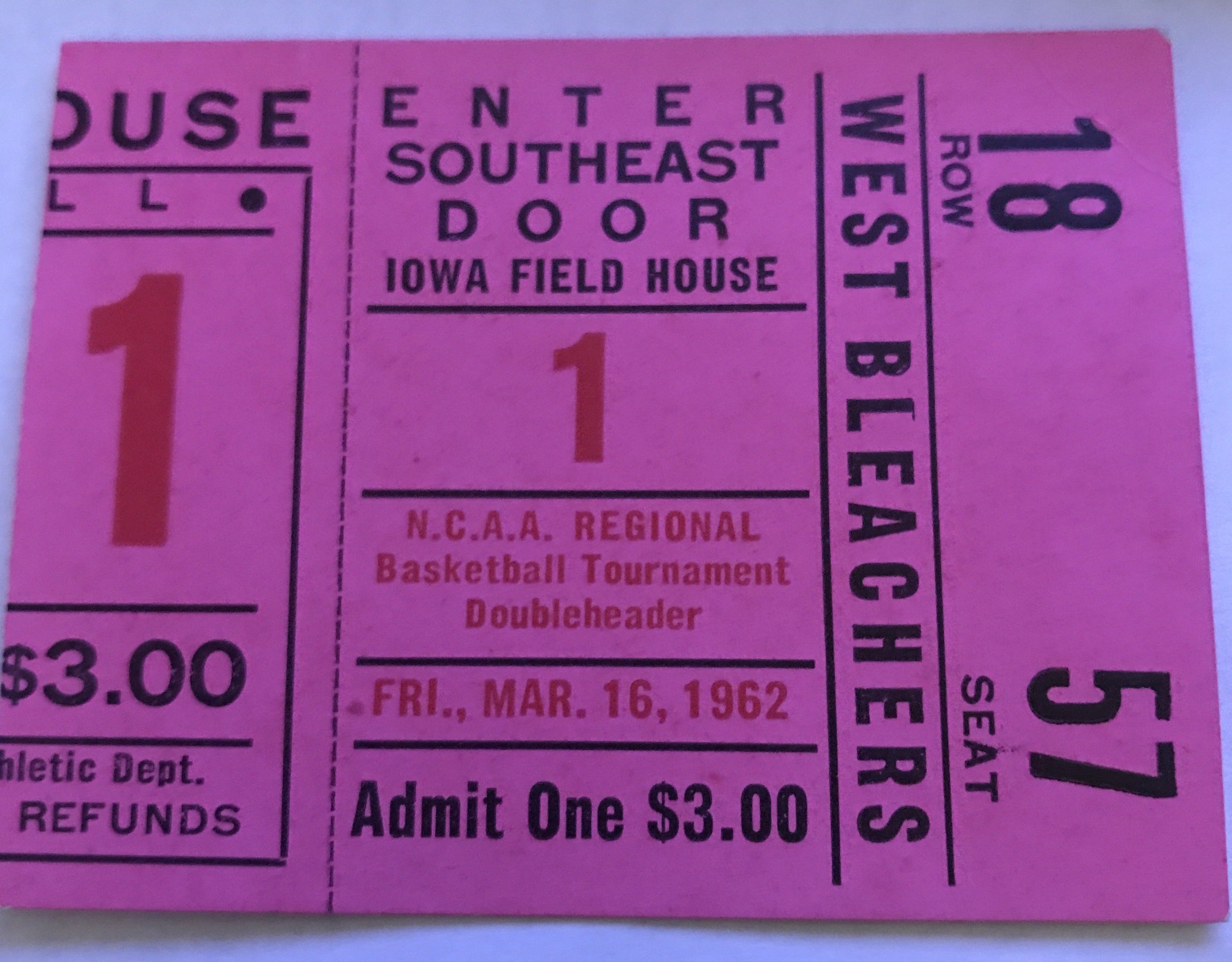 Ticket Stub from the March 16, 1962 NCAA Mideast Regional Doubleheader played the University of Iowa. Teams in the field were Butler, Kentucky, Ohio State & Western Kentucky. The Ohio State team featured John Havlicek, Jerry Lucas, Bobby Knight. The Ohio State team defeated Kentucky in the Regional Final and went on to face Cincinnati in the championship game.