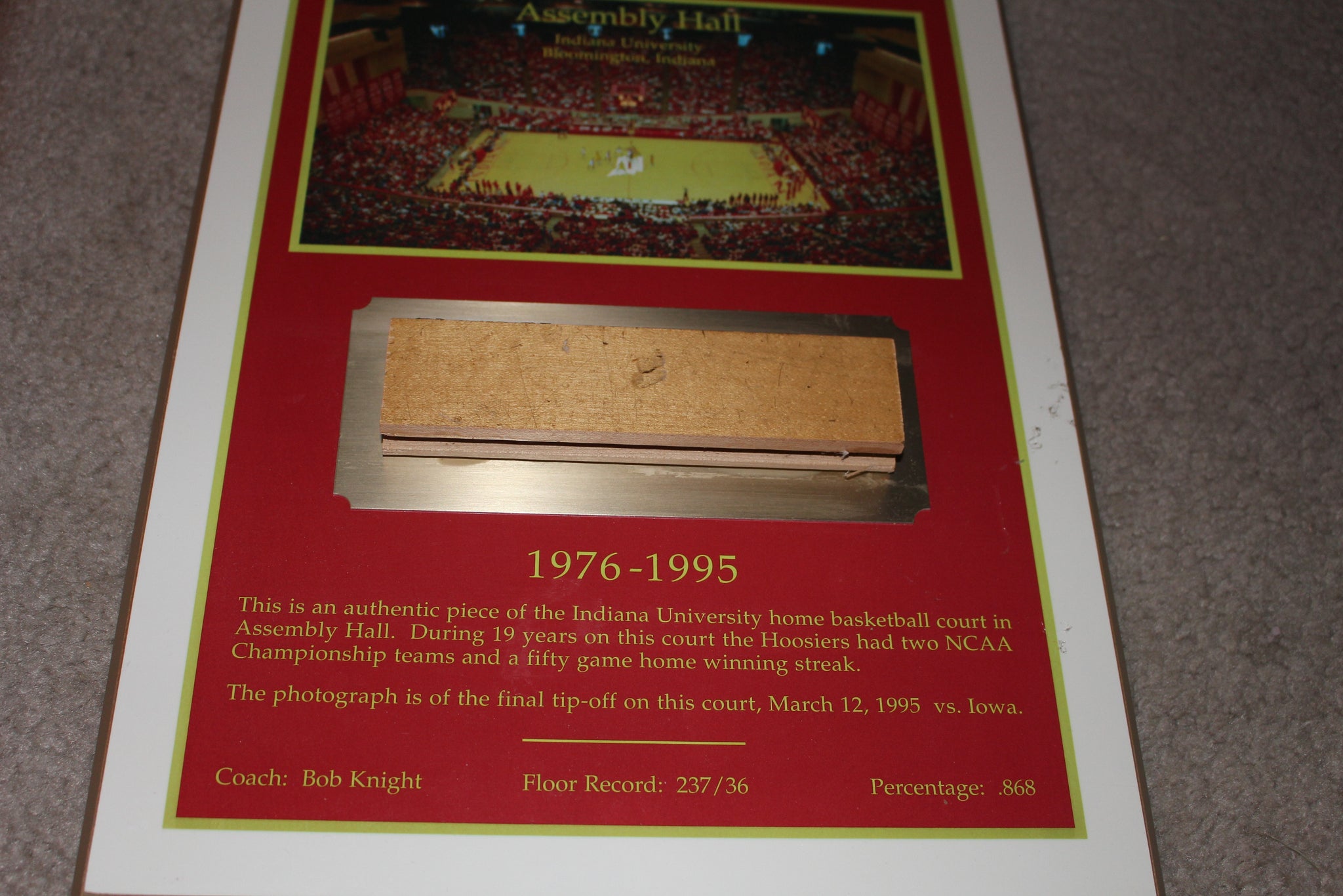 1976-95 Indiana University Basketball Assembly Hall Floor Piece Plaque. We have one plaque remaining in stock it has some slight bubbling of lamination.
