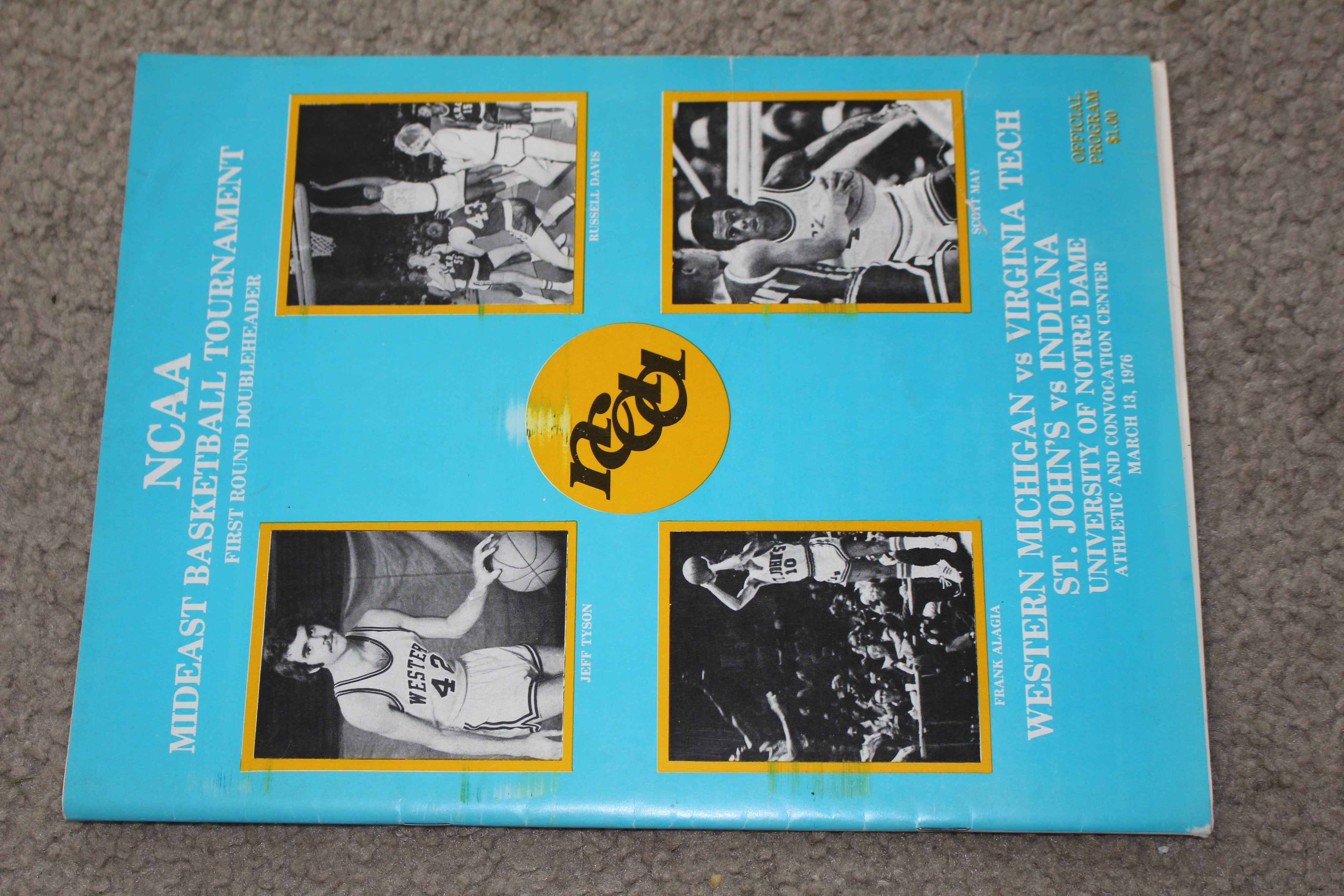Program from the 1st Round Mideast NCAA Basketball tournament games, games were played between Western Michigan vs Virginia Tech, St. Johns vs eventual undefeated champion Indiana University.