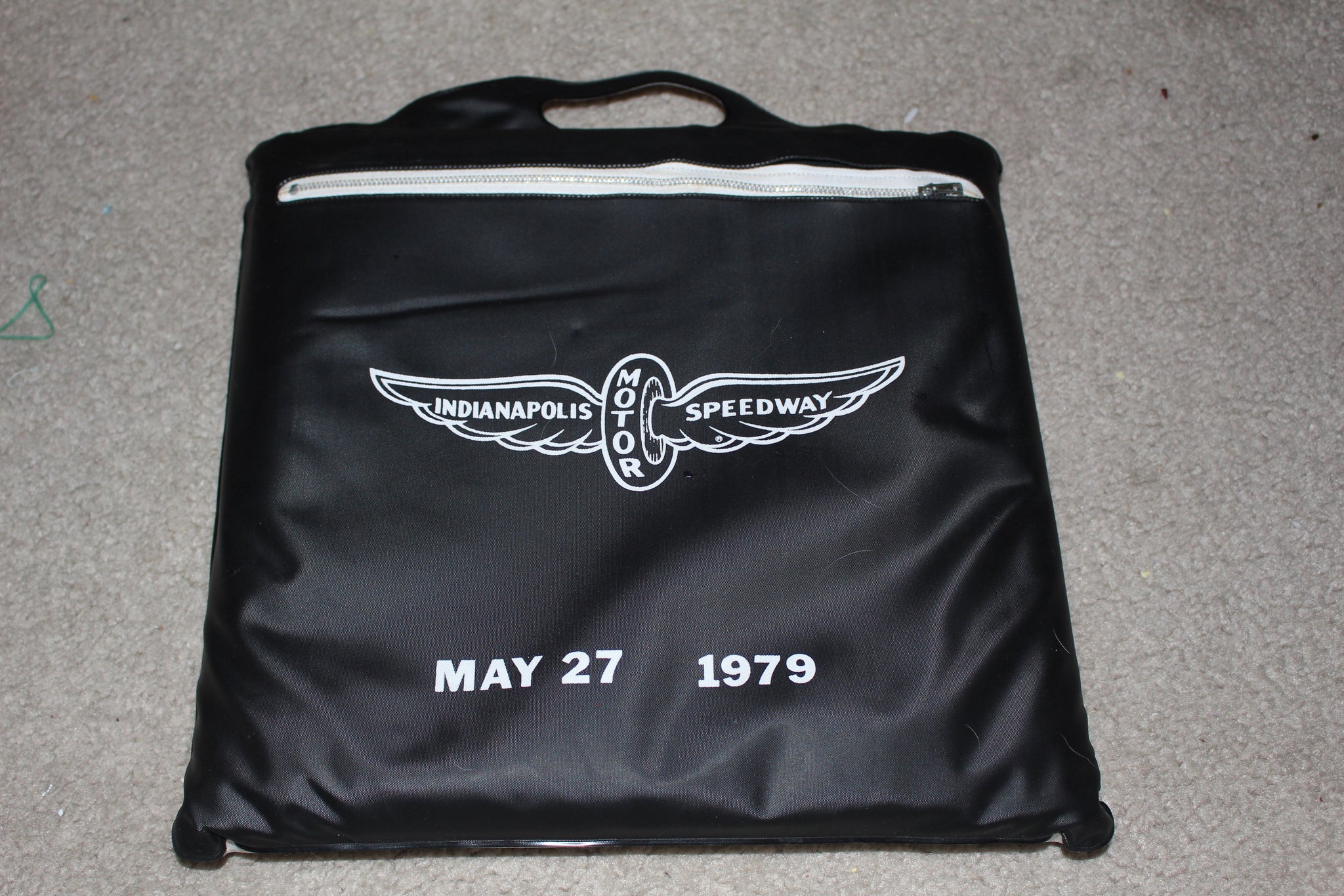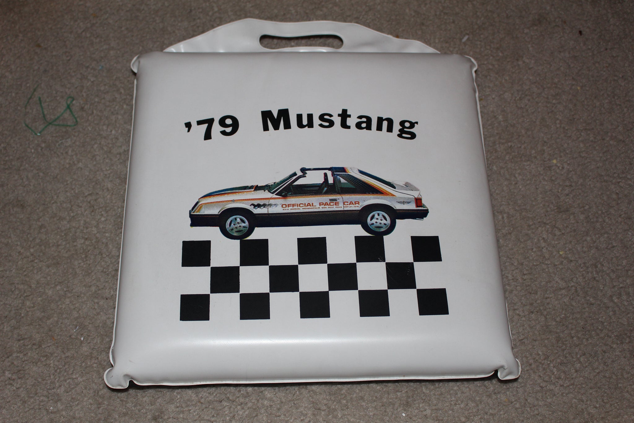 1979 Indy 500 Mustang Pace Car Seat Cushion. The seat cushion is in great condition and comes with unused pancho in the zipper pouch.