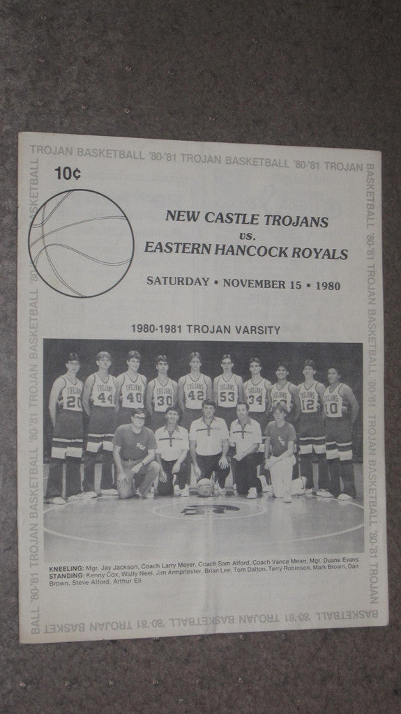 GAME PROGRAM FROM THE NOVEMBER 15, 1980 INDIANA HIGH SCHOOL BASKETBALL GAME PLAYED BETWEEN THE NEW CASTLE TROJANS AND THE EASTERN HANCOCK ROYALS.  STEVE ALFORD FORMER INDIANA UNIVERSITY STAR AND CURRENT HEAD COACH OF NEW MEXICO WAS A SOPHMORE ON THE TEAM.