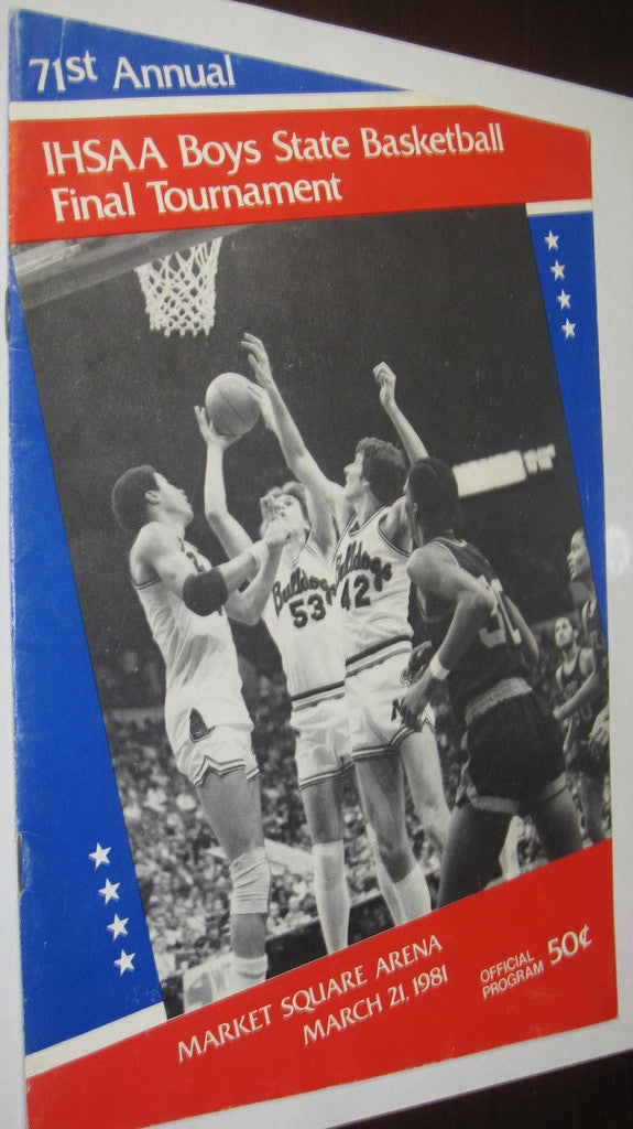 Program from the 1981 Indiana High School Basketball State Finals. Teams in the finals were: Anderson, Warsaw, Vincennes Lincoln, & Shenandoah.