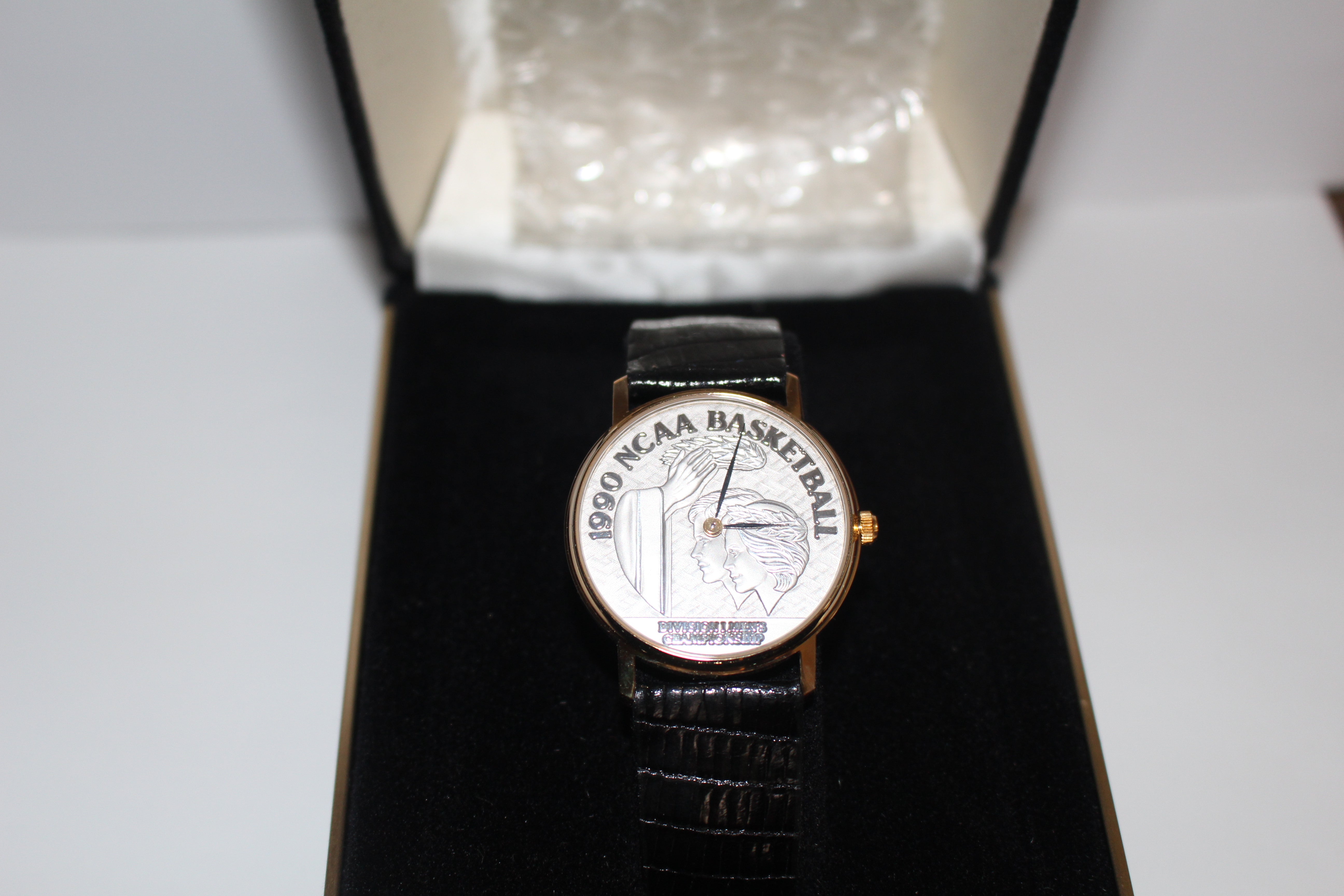 1990 Indiana University NCAA Basketball Tournament Quartz Watch, the watch has never been worn and comes with original box and outer sleeve.  The watch will be accompanied with a letter of authenticity from the original owner of the watch.