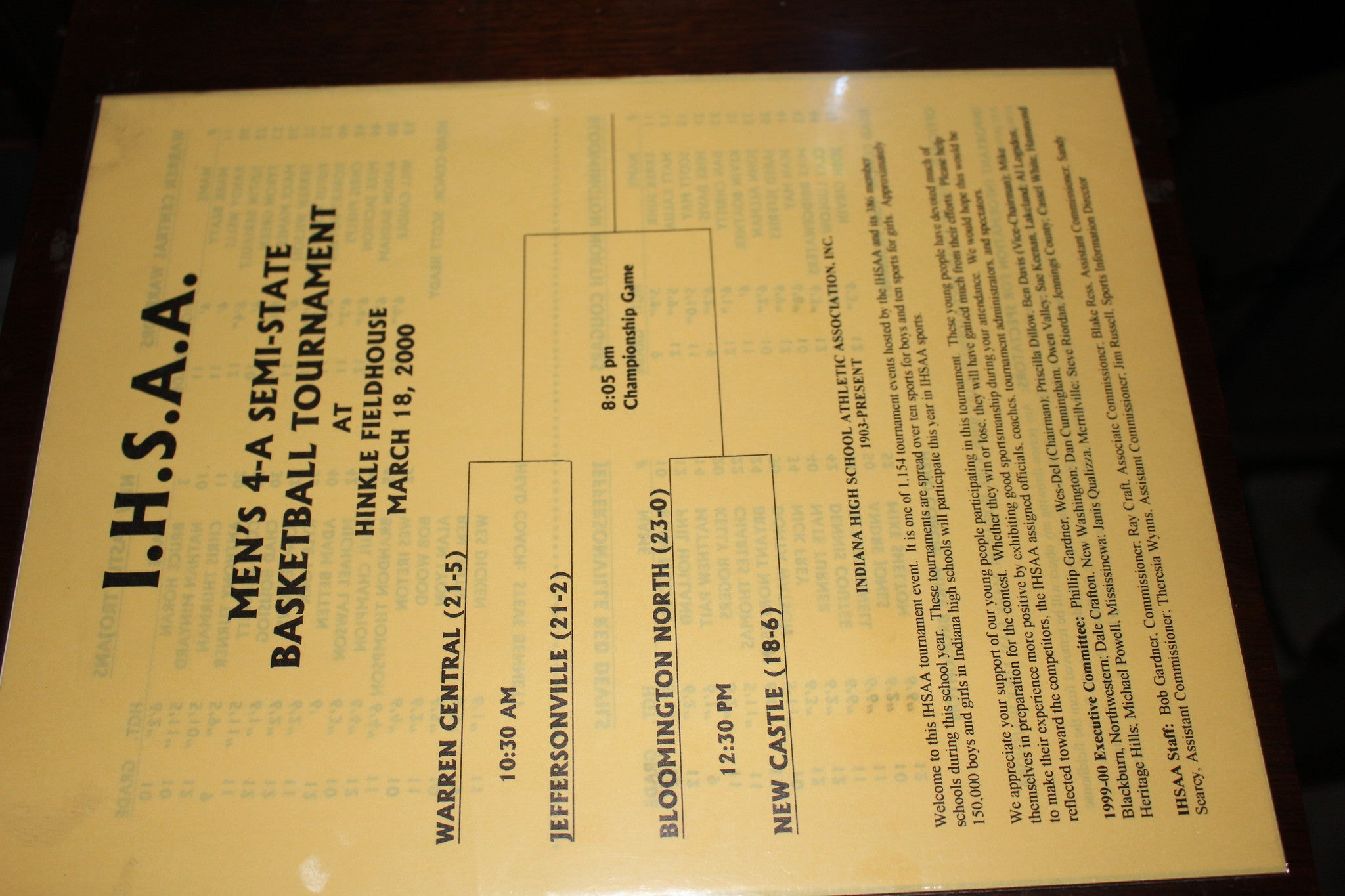 2000 Indiana High School HInkle Fieldhouse Semi-State Basketball Program.  The teams in the tournament were Warren Central, Jeffersonville, Bloomington North, & New Castle.