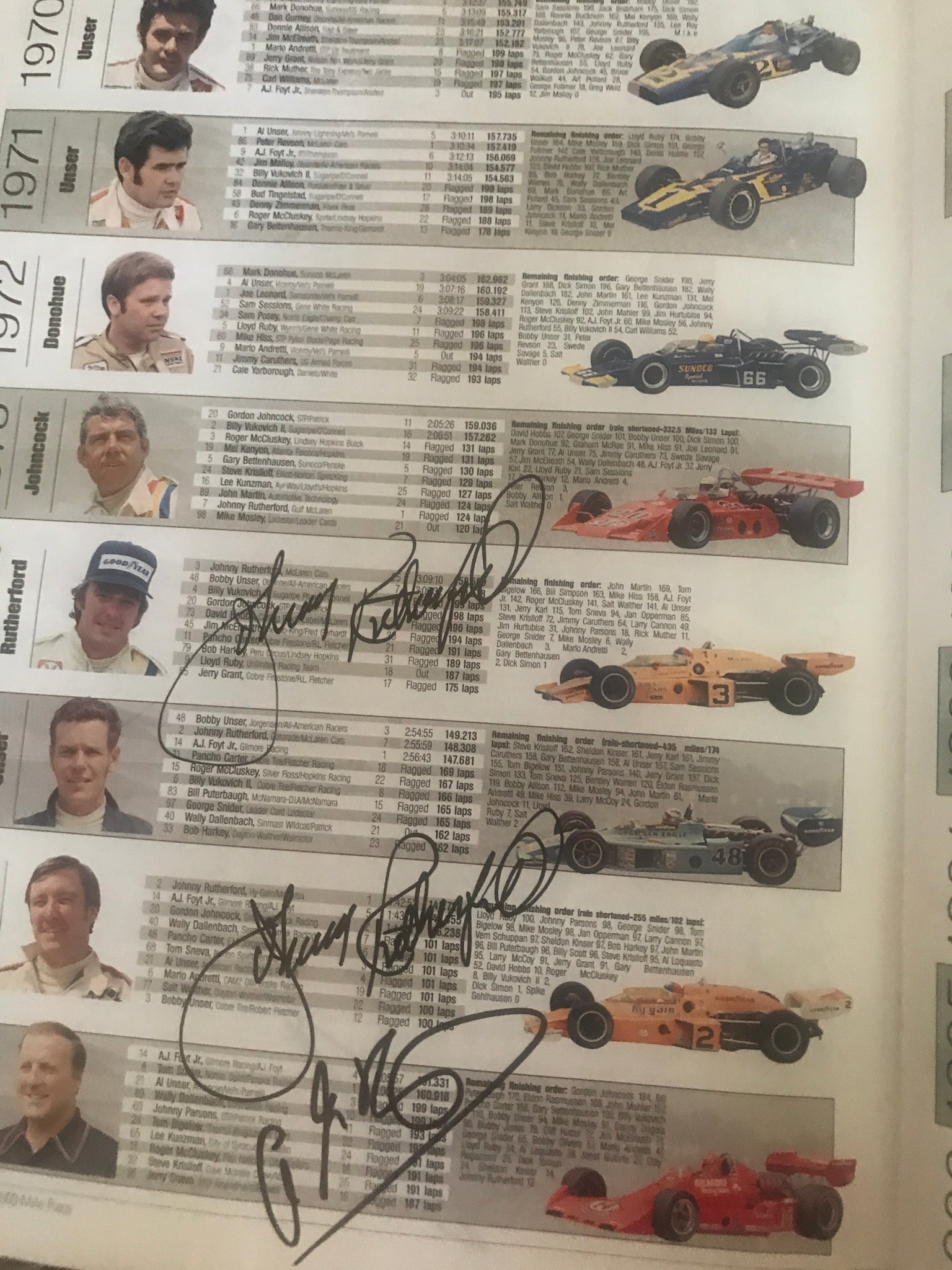 2014 Indianapolis 500 Race Program. The program contains 89 autographs. The program cover has some wear as expected to being handled by almost 100 people. Among the autographs are several winners of this legendary race. Among the autographs are: Dario Franchitti, Gil De Ferran, Al Unser Jr., Rick Mears, Mario Andretti, Bill Vukovich II, Jigger Sirois, Johnny Parsons Jr., Jerry Sneva, Janet Guthrie, Lynn St. James, Tom Bagley, Spike Gelhausen, Buzz Calkins, Pancho Carter, Arie Luyendyk, A.J. Foyt, Dick Simon, Bill Alsup, Bill Puterbaugh, Jack Miller, Eldon Rasmussen, Bob Harkey, Paul Page, Justin Wilson, Alex Tagliani, Oriol Servia, Sebastian Saavedra, Takuma Sato, Graham Rahal, Will Power, Simon Pagenaud, Martin Plowman, Josef Newgarden, Carlos Munoz, Charlie Kimball, Pippa Mann, Sage Karam, James Hinchcliffe, Ryan Hunter Reay, J.R. Hildebrand, Jack Hawksworth, Ed Carpenter, Conor Daly, Ryan Briscoe, Kurt Busch, Max Pappis, Sebastien Bourdais, Townsend Bell, Marco Andretti, Mikhail Aleshin, Buddy Lazier, Michael Andretti, Jacques Villeneuve, Juan Pablo Montoya, Tony Kanaan, Scott Dixon, Helio Castroneves, Scott Goodyear, Tony George, Sarah Fisher, Johnny Rutherford, Bobby Rahal.
