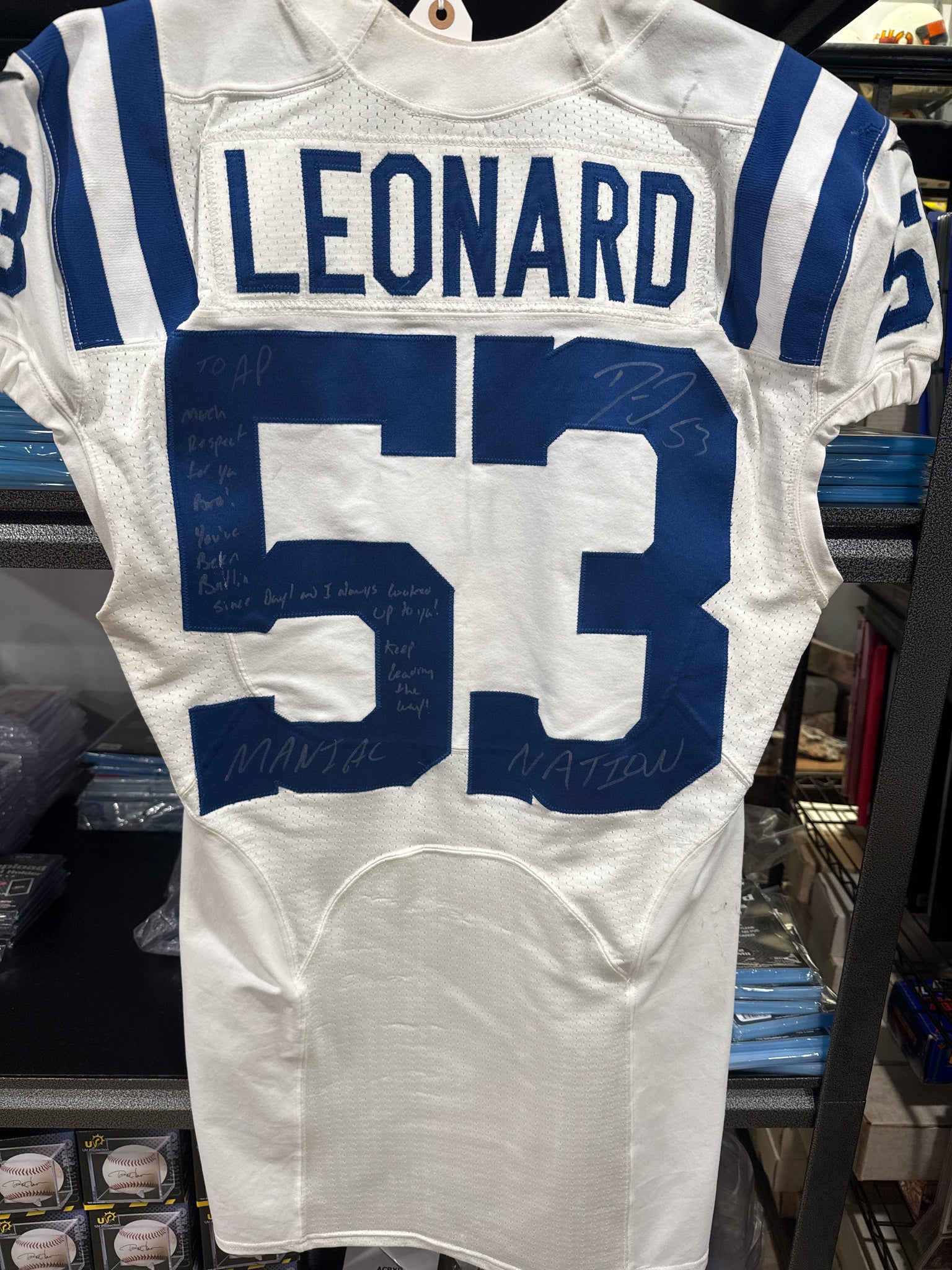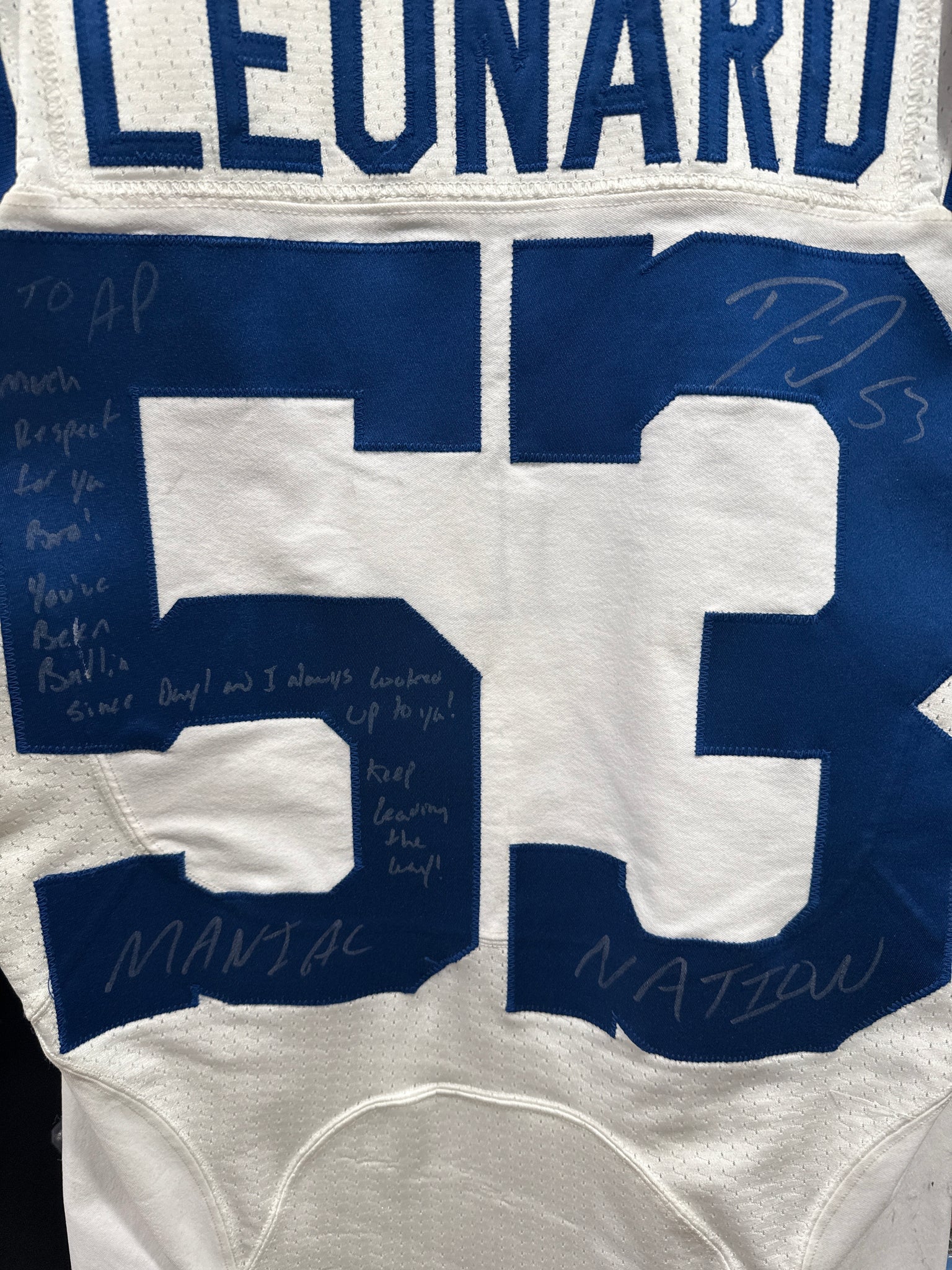 This jersey was given to Adrian Petersen by Leonard in 2020. It is signed to AP and inscribed "Much respect to you Bro! You've been ballin since day 1 and I have always looked up to you Keep leading the Way! Maniac Nation" And signed Darius Leonard.