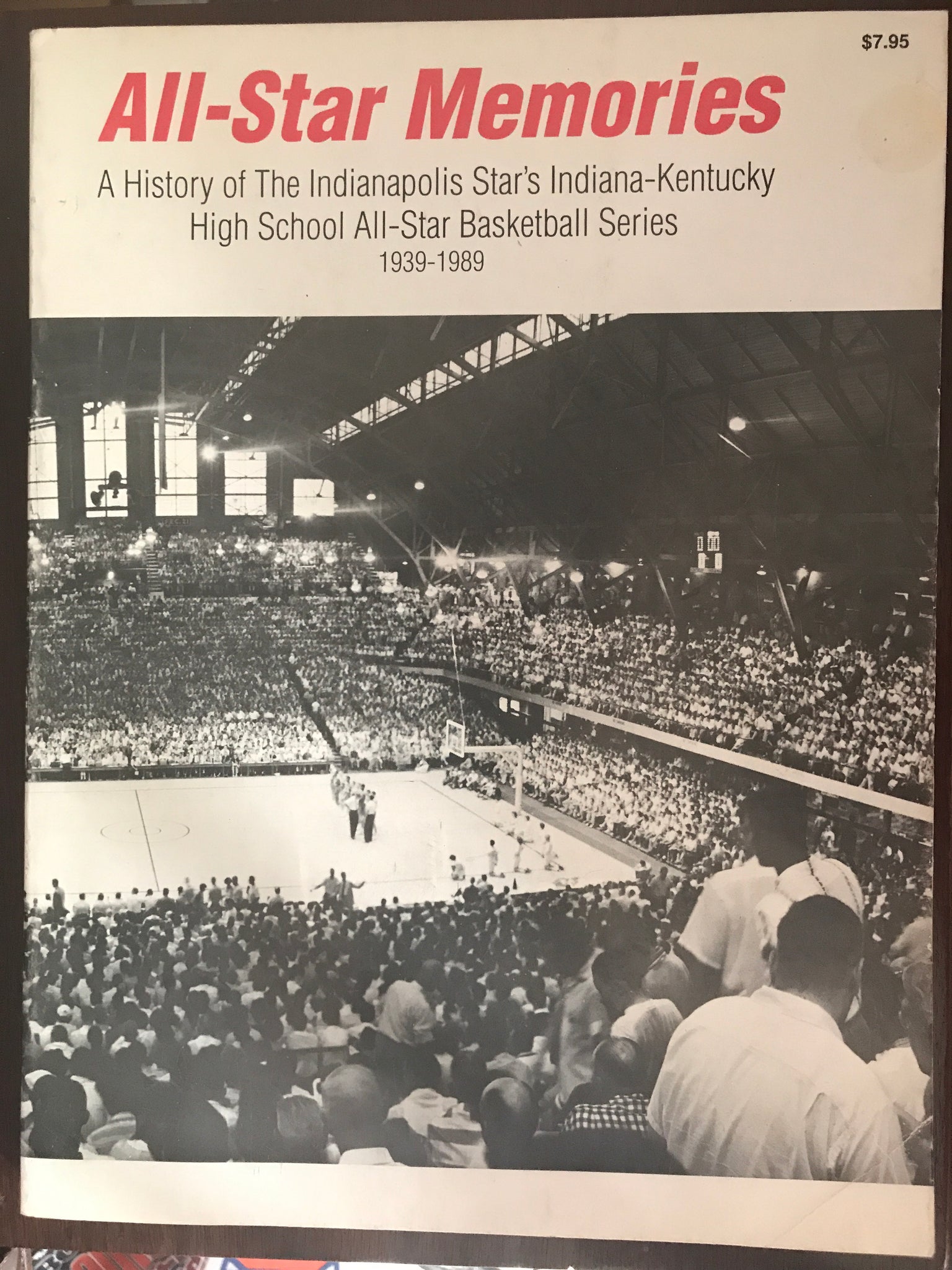 Oversized Paperback book that recaps the Indiana Kentucky High School Basketball All Star Games from 1939-1989. The book is titled "All-Star Memories", A History of The Indianapolis Star's Indiana-Kentucky High School All-Star Basketball Series 1939-1989.