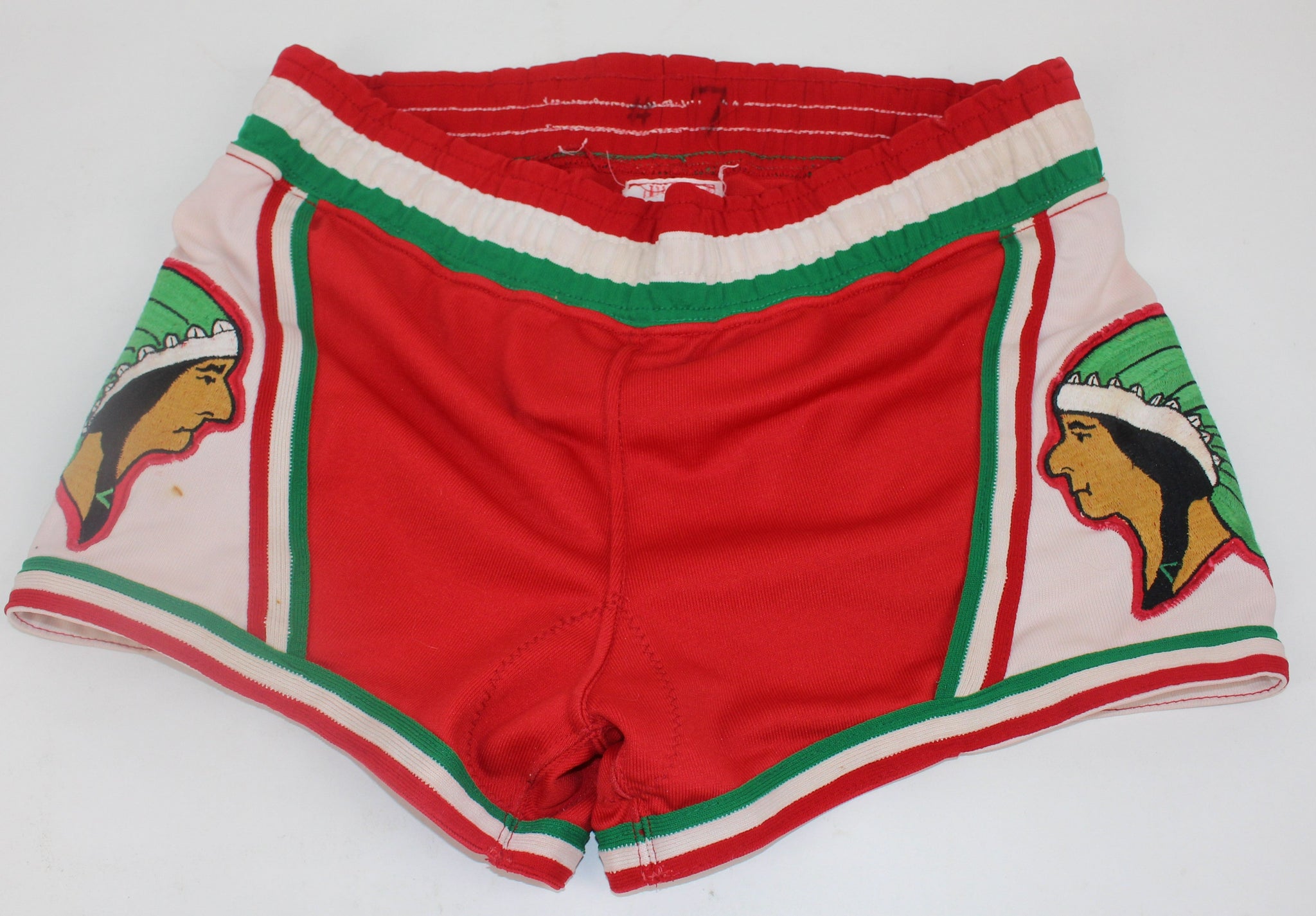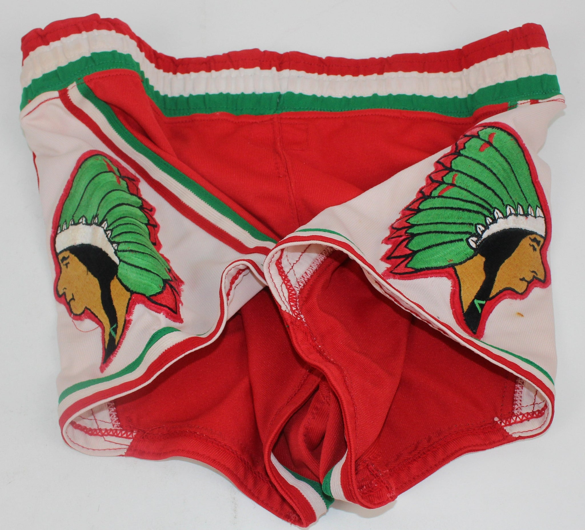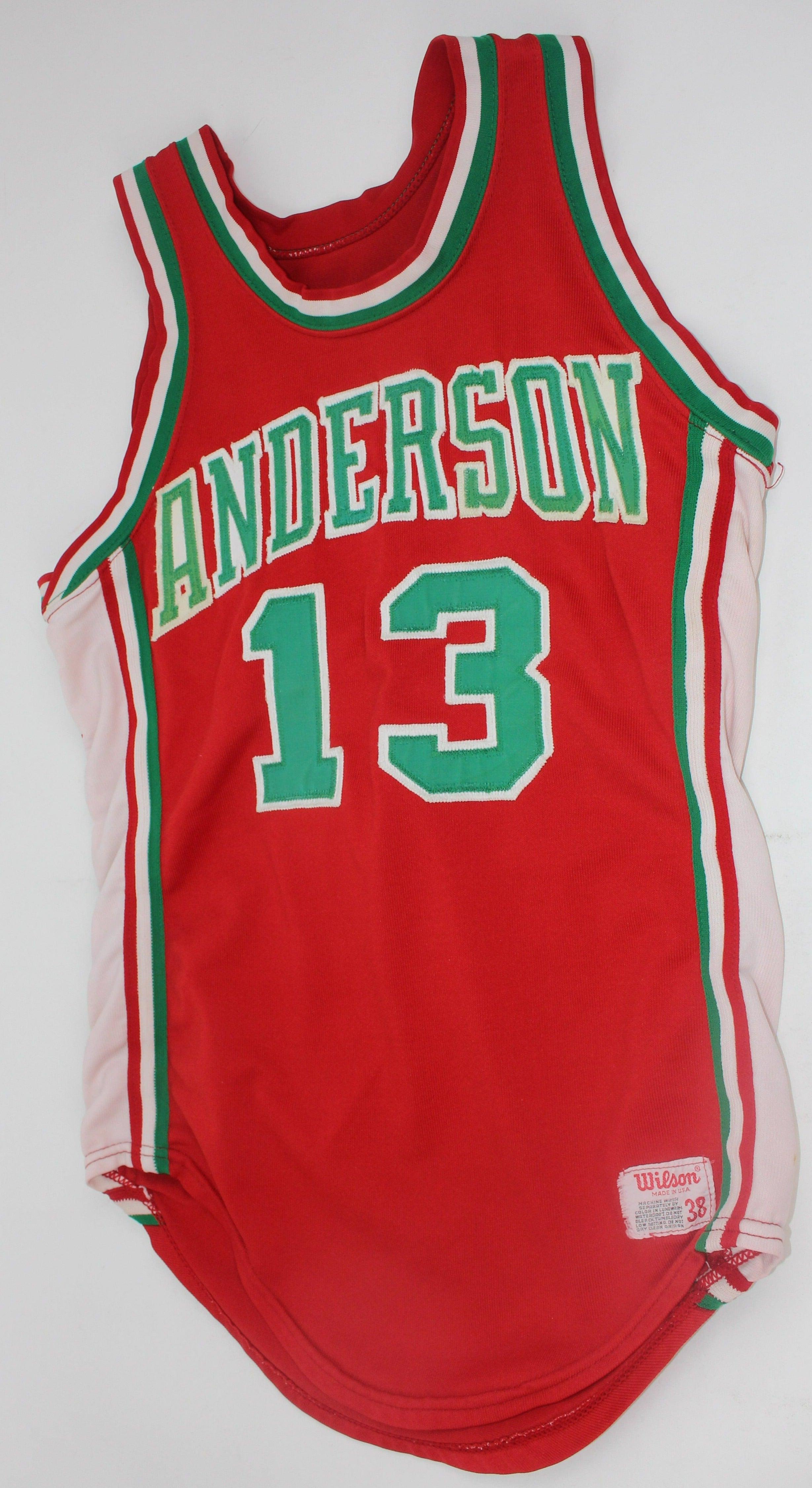 Vintage Anderson, Indiana High School Basketball Uniform. The uniform is the road read with green lettering and numbers. Fantastic logo on both sides of the shorts. A great piece of Indiana High School Basketball History.
