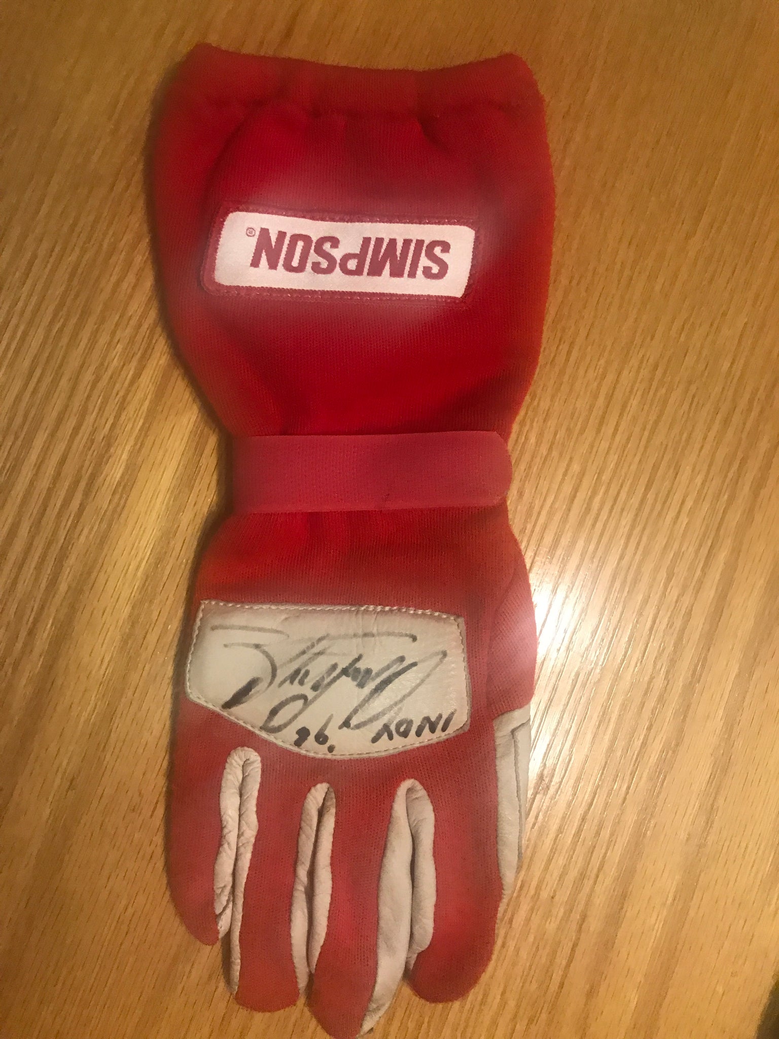 Arie Luyendyk 1996 Indianapolis 500 Race worn and autographed Simpson racing glove.