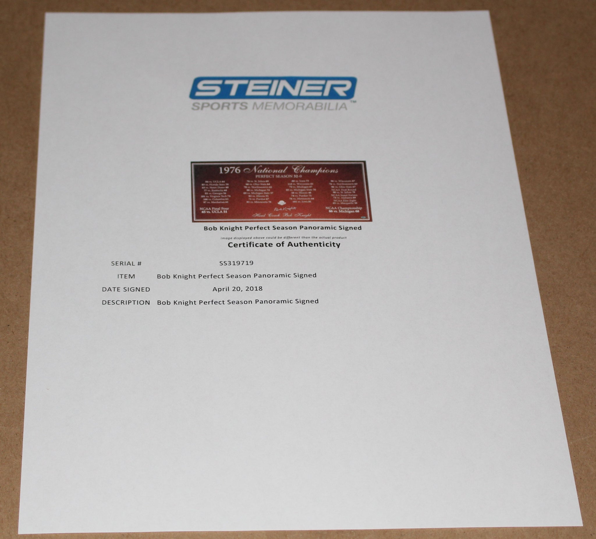 Bob Knight Autographed 1976 Perfect Season Panoramic Photo.  The autograph is authenticated by Steiner Sports.  The photo measures aprox 32 inches wide by 14 inches in height.