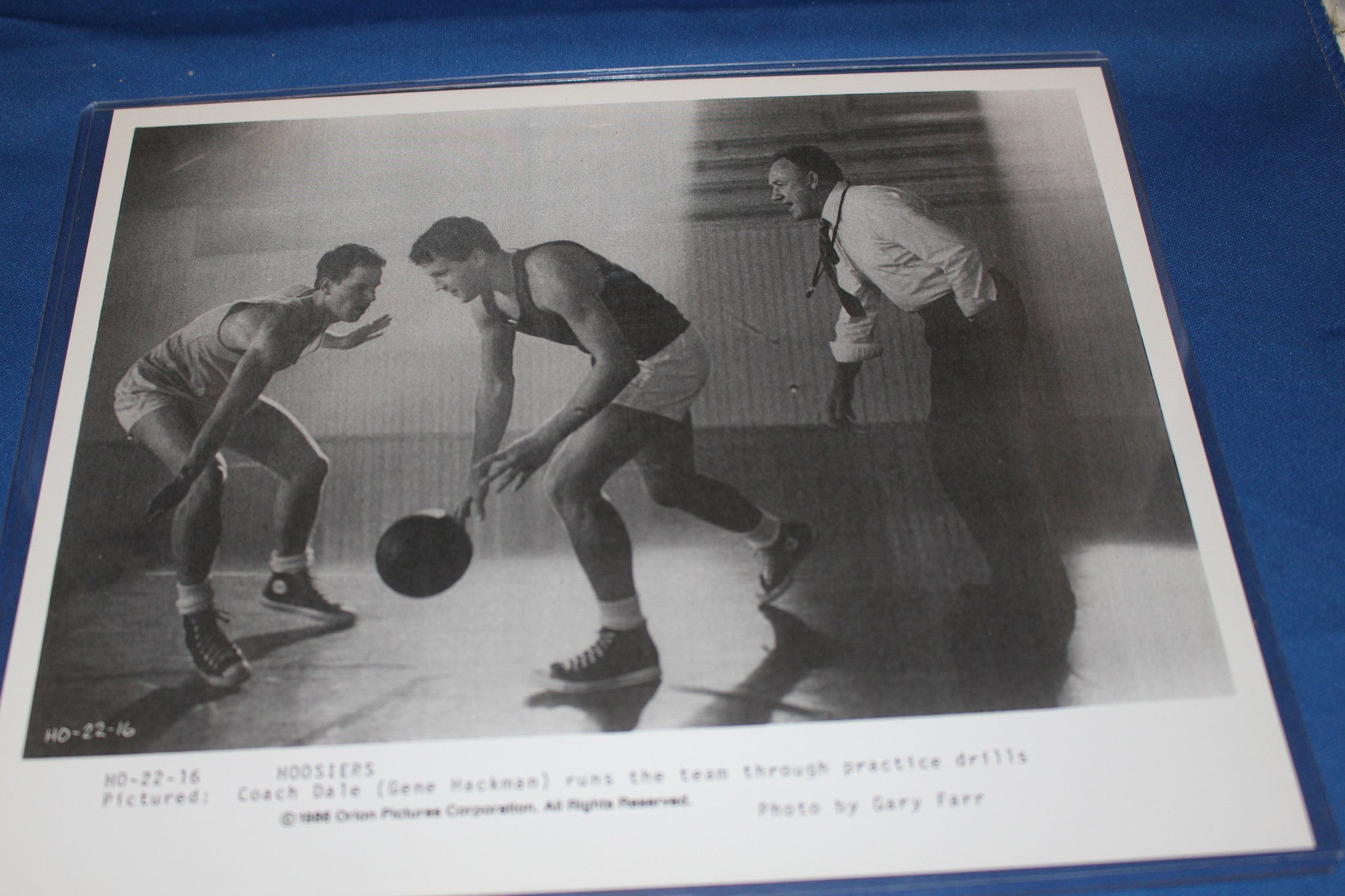 4 items to commemorate the classic movie Hoosiers. Included are: 8x10 photo of Gene Hackman, Movie Promo Photo, October 1985 Indianapolis Monthly Magazine, and a commemorative insert from the Knightstown Tri-County Banner commemorating the films opening in the town where the home gym is located.