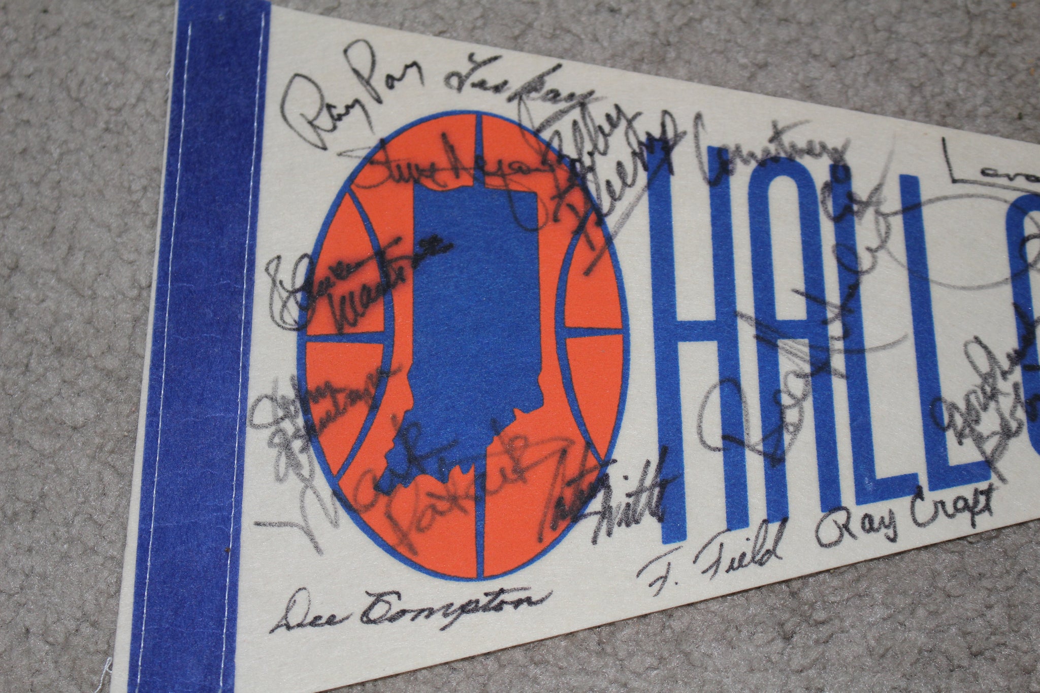 Indiana Basketball Hall of Fame Autographed Pennant.  Signed by 18 players, among the signatures are: Ray Pavy, Steve Alford, Bobby Plump, Bob Netolicky, Ray Craft, Dee Compton Courtney Cox, Courtney Witte, and others.