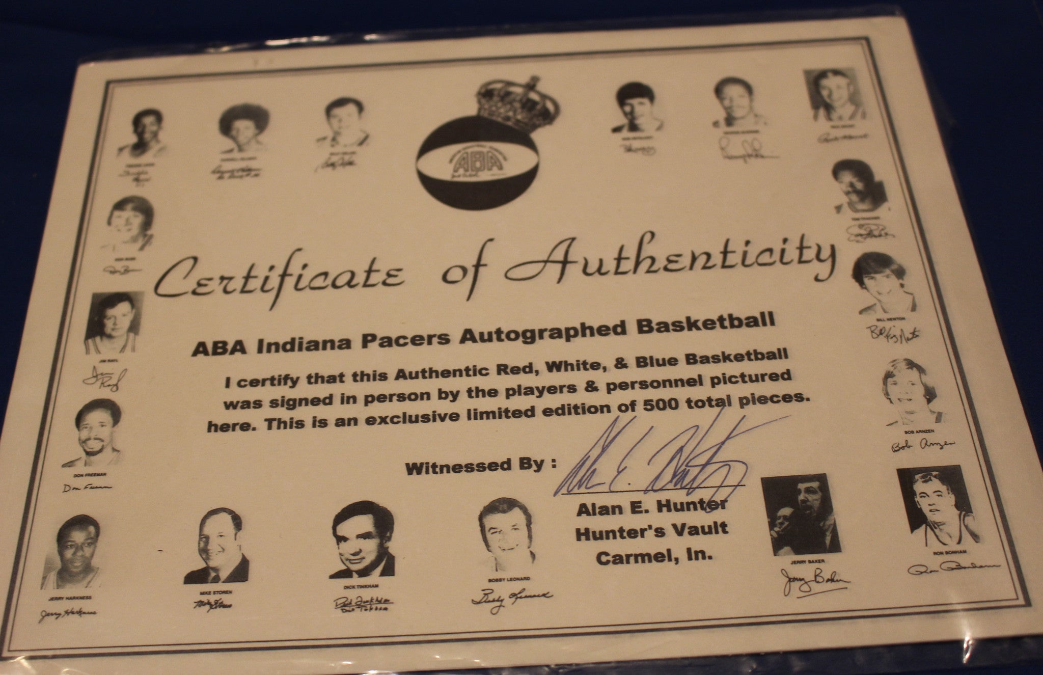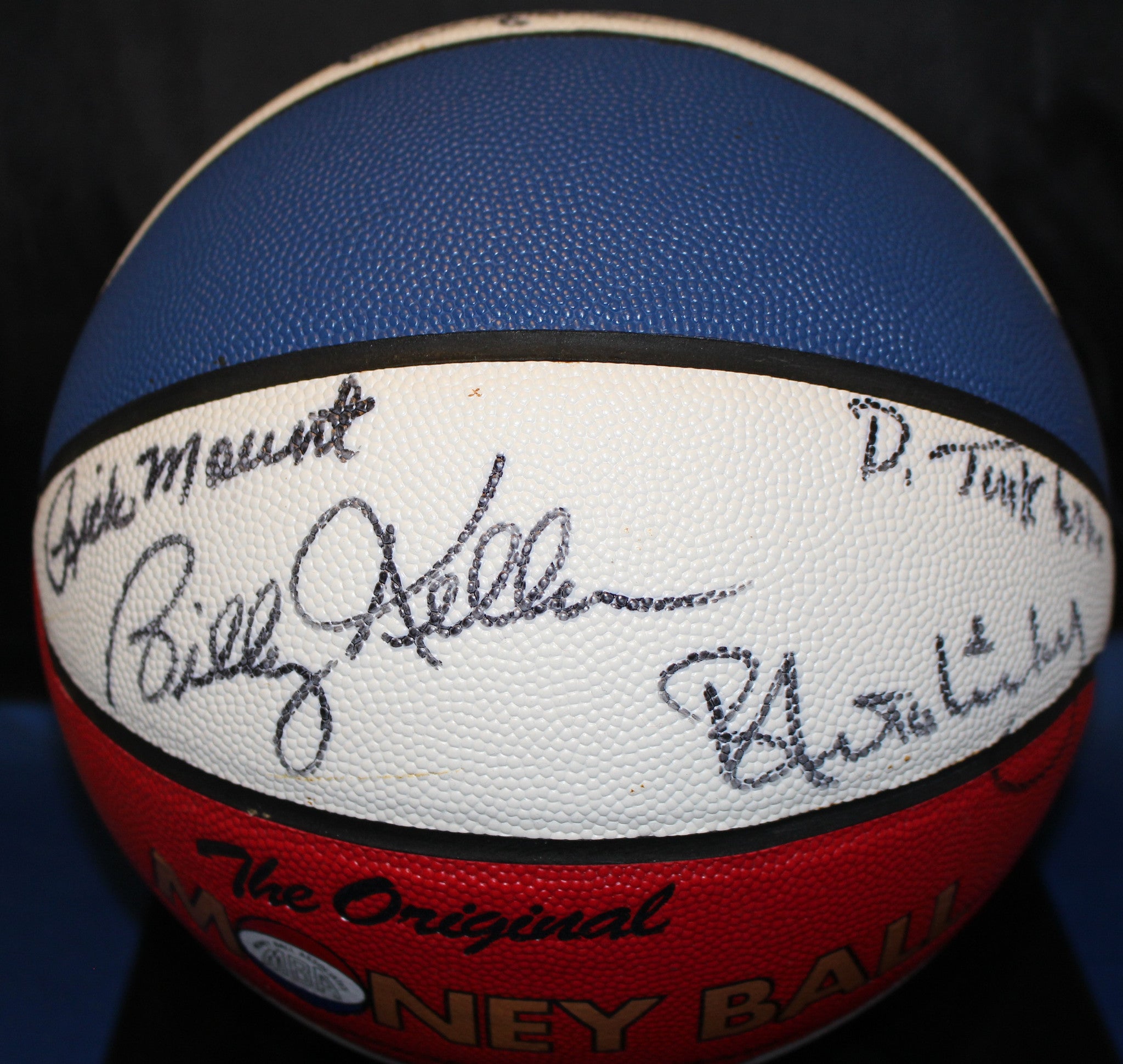 Indiana Pacers Autographed ABA Money Ball, autographed by Freddie Lewis, Darnell Hillman, Billy Keller, Bob Netolicky, George McGinnis, Rick Mount, Don Buse, Jim Rayl, Don Freeman, Jerry Harkness, Tom Thacker, Bill Newton, Bob Arnzen, Ron Bonham, Mike Storen, Dick Tinkham, Bobby Leonard, Jerry Baker.  Comes with COA from Hunter's Vault.  Will also come with display case to proudly display this fantastic basketball.