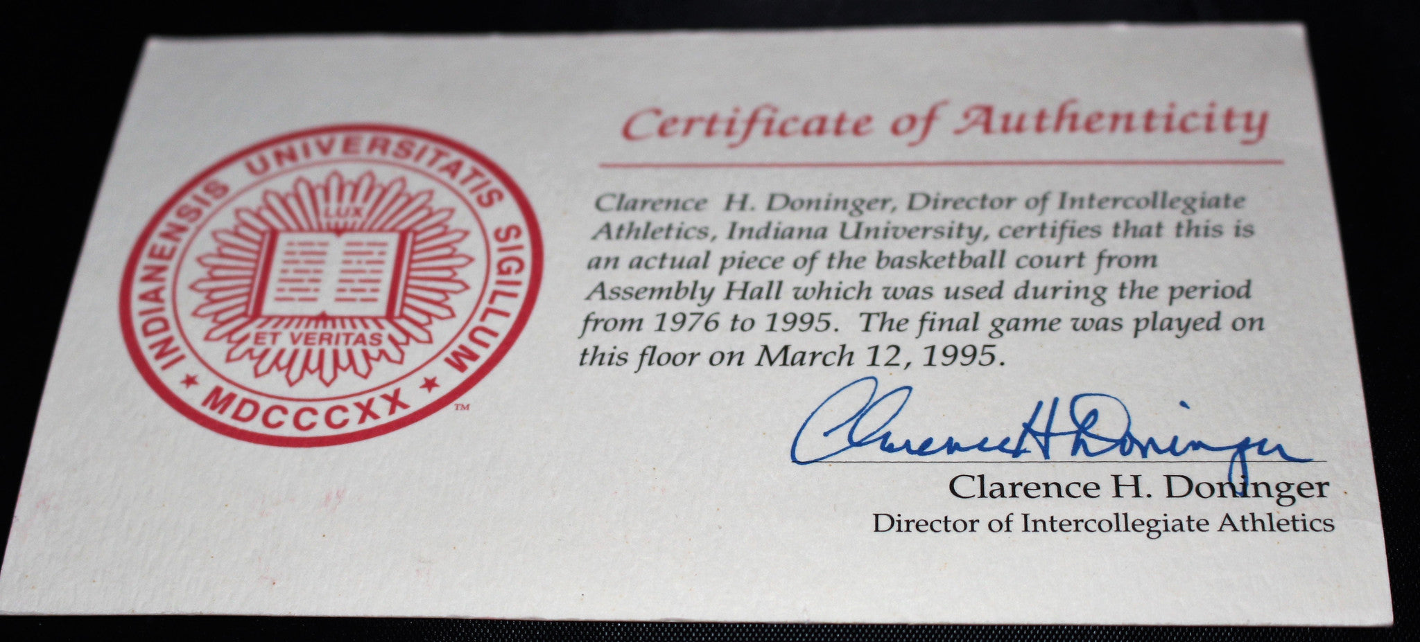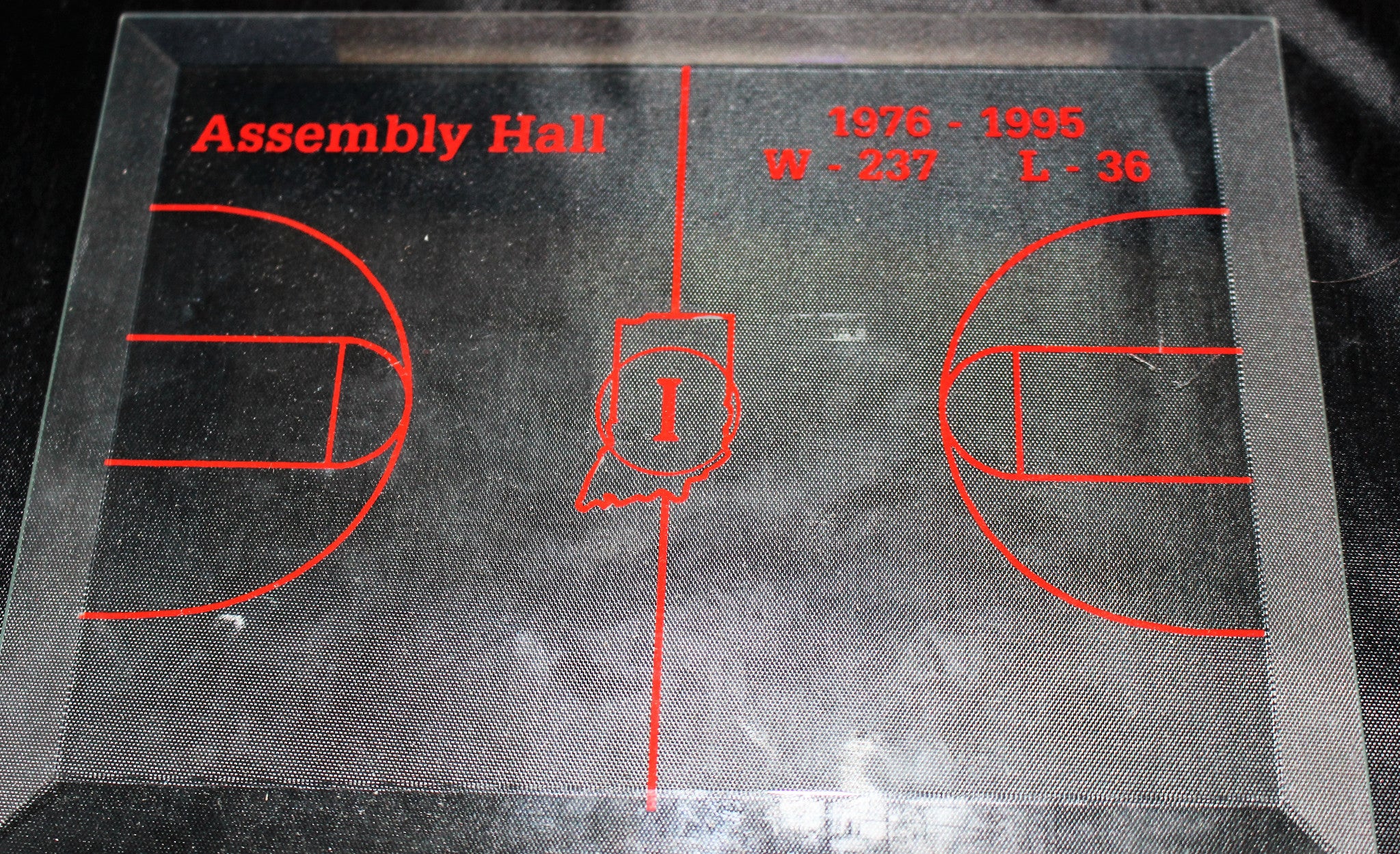 Indiana University Assembly Hall Floor Piece with etched glass display. The piece of floor is from the court used by the Indiana Hoosiers Basketball team from 1976-1995. The floor pieces measures 6 inches by 3 inches, the etched glass measures 8 inches by 6 inches. Comes with a COA from the Indiana University Athletic Department