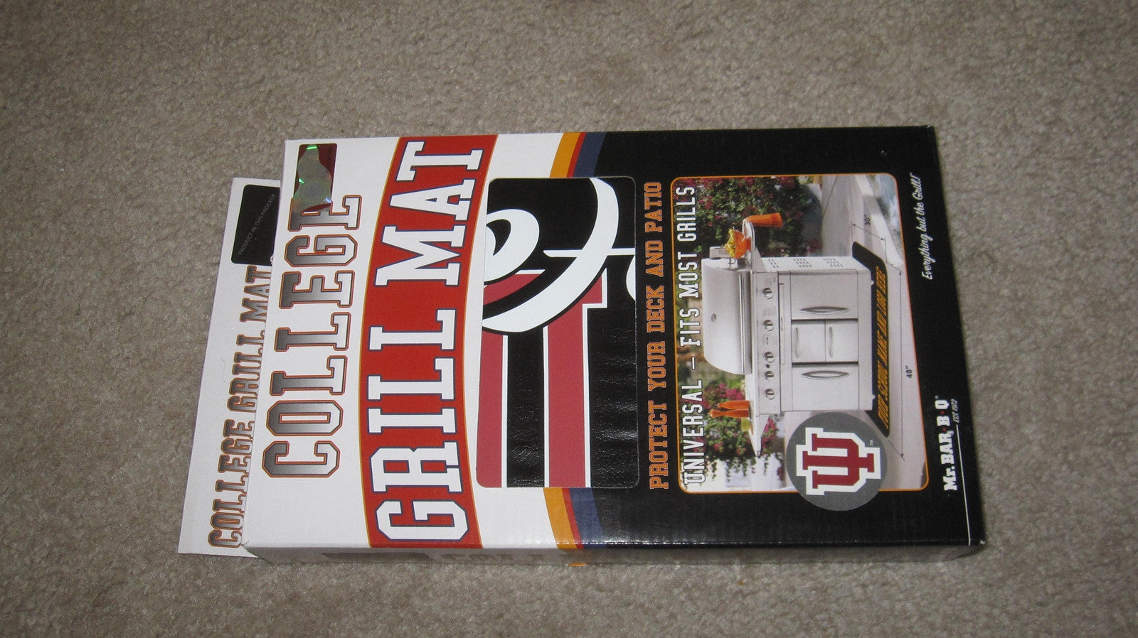 Indiana University Grill Mat, New in Box!. The grill mat is Mr. Bar B Q, fits most grills. Prevents spills from soaking into decks and patios, absorbs grease and oil, non slip waterproof backing, can be rolled and stored compactly, easily cleans up with a garden hose, measures 48 inches by 30 inches.