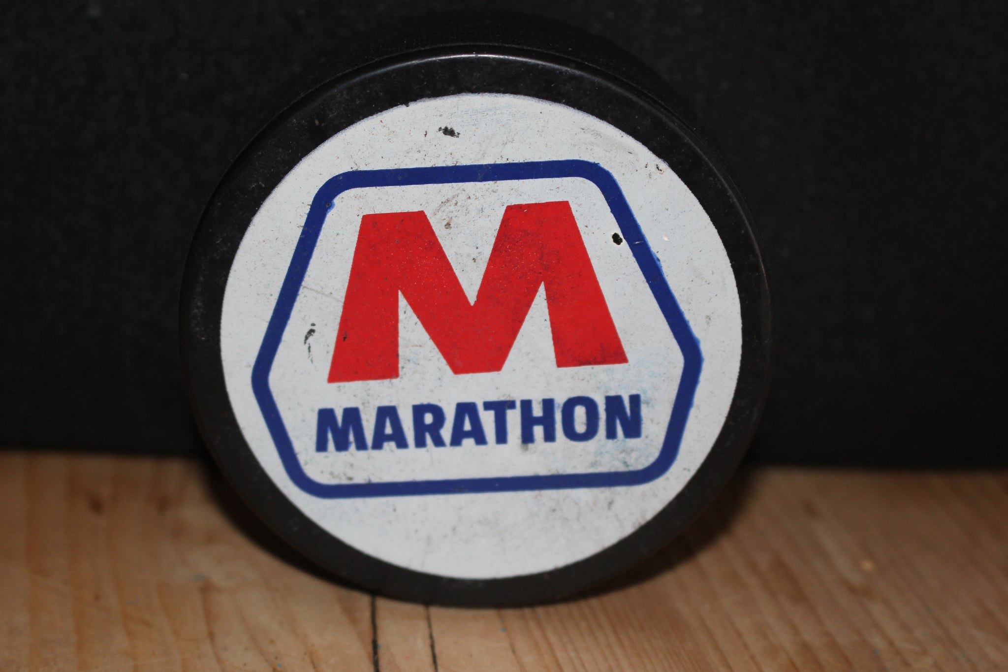 Indianapolis Checkers 1980's Stadium Give Away Hockey Puck, the give away was sponsored by Marathon Oil.