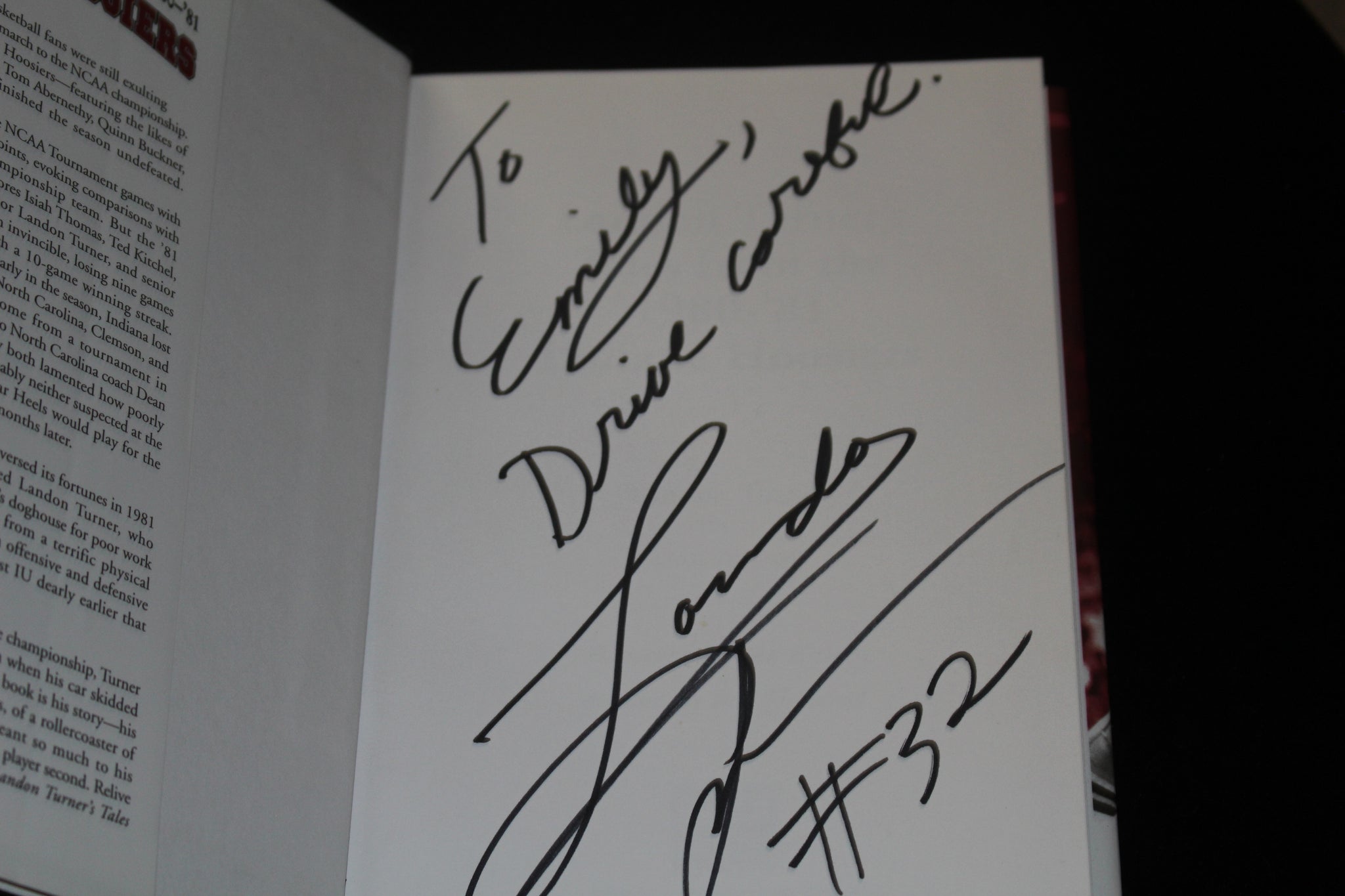 Landon Turner's Tales from the 1980-81 Indiana Hoosiers Autographed hardback book. The autograph is personalized "To Emily".