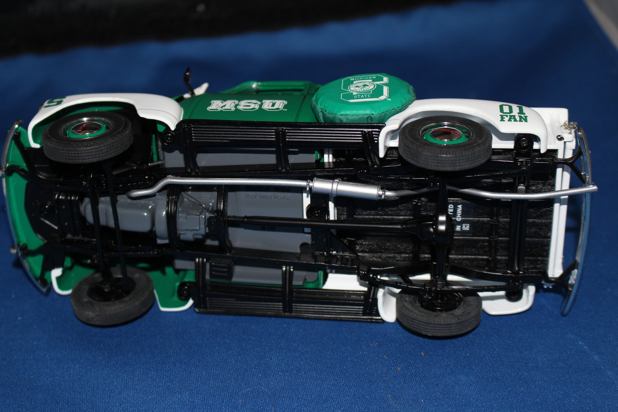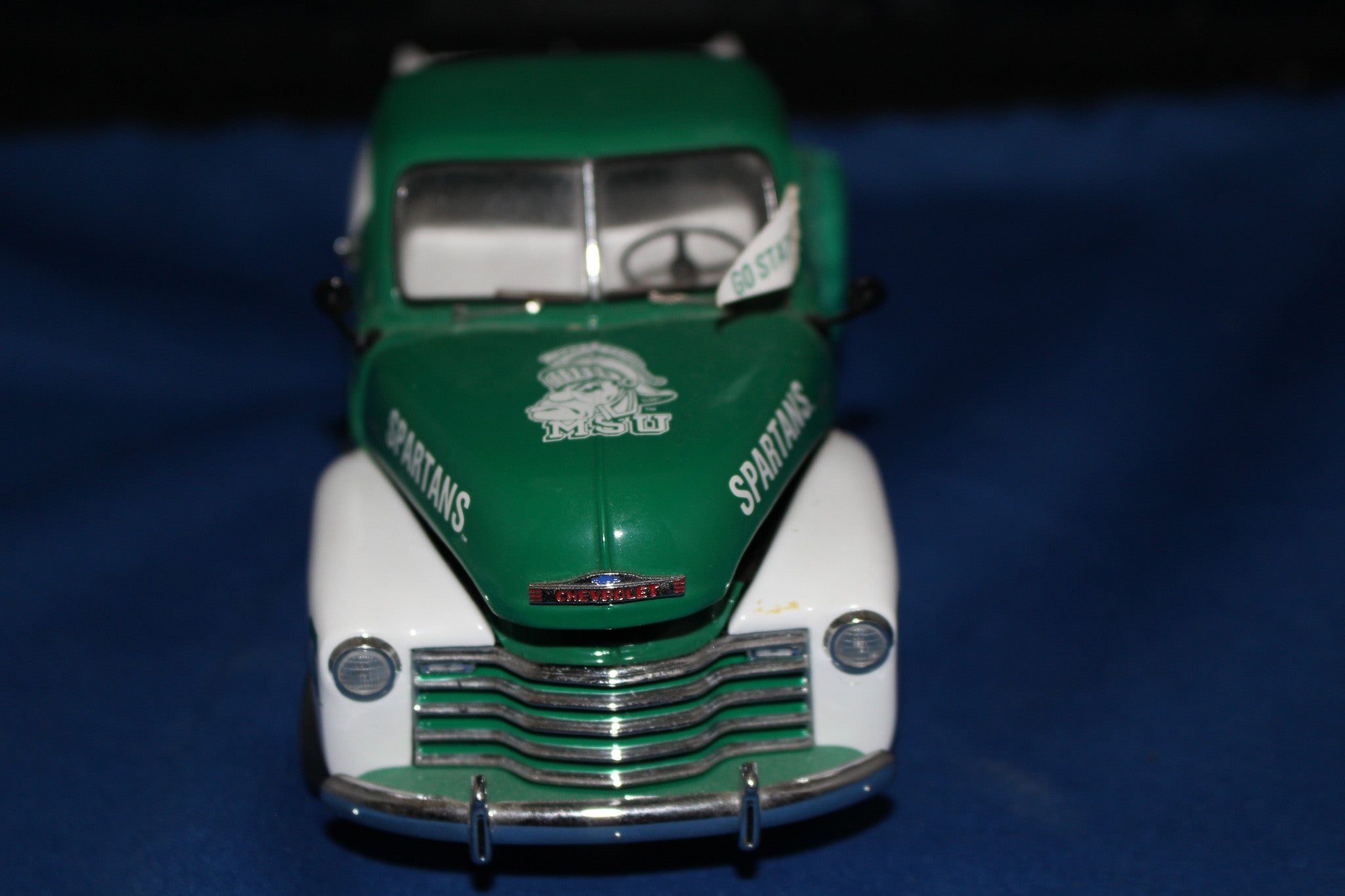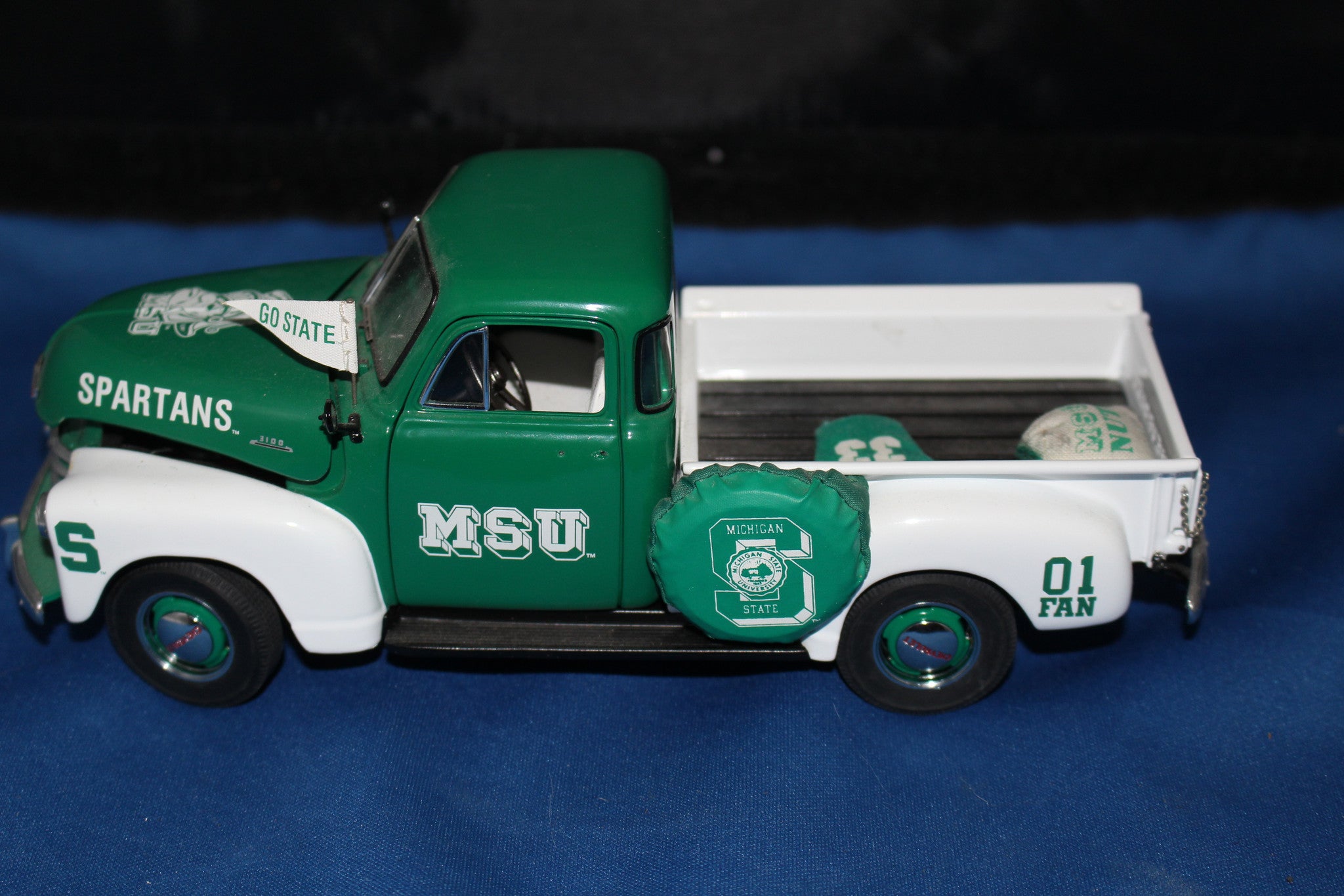 Michigan State 1953 Chevy Tailgate Pickup by Danbury Mint. The truck has been previously displayed, without box in excellent condition. Comes with the 2 accessories shown.